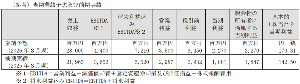 本株式取得により、HRteam社の業績を連結し、連携を図ることで今後の大きな企業価値向上を見込んでおります。なお、HRteam社の前期(2025年6月期)業績は順調な増収増益で、また当期においても継続的な成長を見込んでおり、株式譲渡実行日2025年11月4日を前提とした場合、当社2026年3月期第3四半期より連結される予定で主に人材領域の人材紹介サービス業績拡大に大きく寄与することを見込んでおりますが、2026年3月期連結業績への影響は現在精査中であり、今後の業績に与える影響が判明次第、速やかに公表いたします。