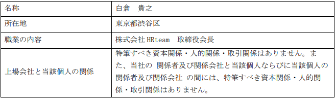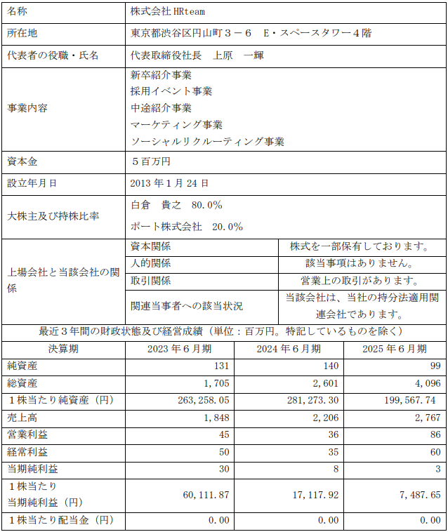 HRteam社は、「働くに挑む」をビジョンに掲げて2014年より事業を開始し、求人企業向けの採用支援サービスを提供し、新卒、既卒、第二新卒などの20代の人材紹介業において高い成長を遂げている企業であり、新卒層向けの人材紹介件数規模で最大手クラスに位置する企業であります。また、当社の人材領域アライアンスサービスにおいても事業立ち上げ時から10年程度の継続的な取引実績があり、またその取引規模も年々拡大しており、当社アライアンスサービスの取引規模としても上位クライアントに位置付けられます。