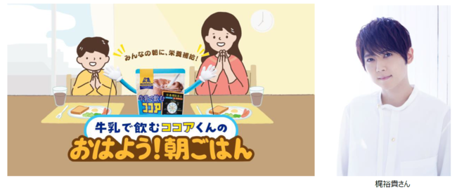 本動画は、”朝ごはん調査団員”の牛乳で飲むココアくんがご家庭の朝ごはんのシーンに突然登場し、朝ごはんが栄養たっぷりかどうかをチェックするという内容になっています。ちょっとお調子者で押しが強い牛乳で飲むココアくんの声は人気声優の梶裕貴さんが担当します。