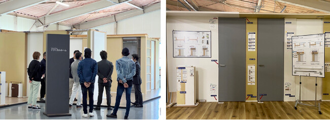 当社が開発したフルハイトドア(R)は取り付け方法が独自なこともあり、2005 年の発表当時は新しいものを受け入れたがらない大工さんたちからは採用を敬遠されがちでした。ですが、デザイン性の高さや空間を広く感じられるといったメリットが知られるようになり、施主の方から「わが家にフルハイトドアを付けたい」と要望されるケースが増加、採用いただく工務店も増えてきました。そこで2013年、取り付けを希望する工務店やビルダー向けに、実製品を使用してドアの設置に関する不安や疑問を解消する「テクニカルルーム」を開設。実際の家のように柱や壁、天井を再現し、ドアの取り付け方を学べるようにしました。