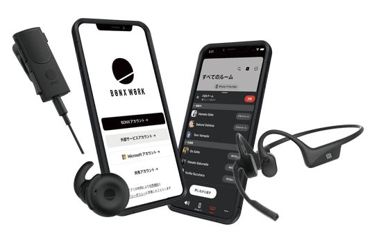 現場コミュニケーションのワンストップソリューション「BONX WORK」。1人1台のスマートフォンとイヤフォンさえあれば、グループトークや文字起こしなど、デスクレスワーカーの生産性を高める多彩な機能を即座に利用可能です。