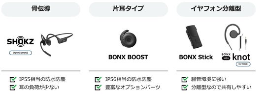 入浴介助中でも安心な防水性能(IP56)を備えたモデルや、長時間のシフトでも快適な軽量・ロングバッテリーモデルなど、現場のニーズに合わせたデバイス選択が可能です。現場の声を形にしてきたBONXならではの高精度な集音性能により、騒音下でも「あなたの声」だけをクリアに抽出し、安定した音声記録を実現します。