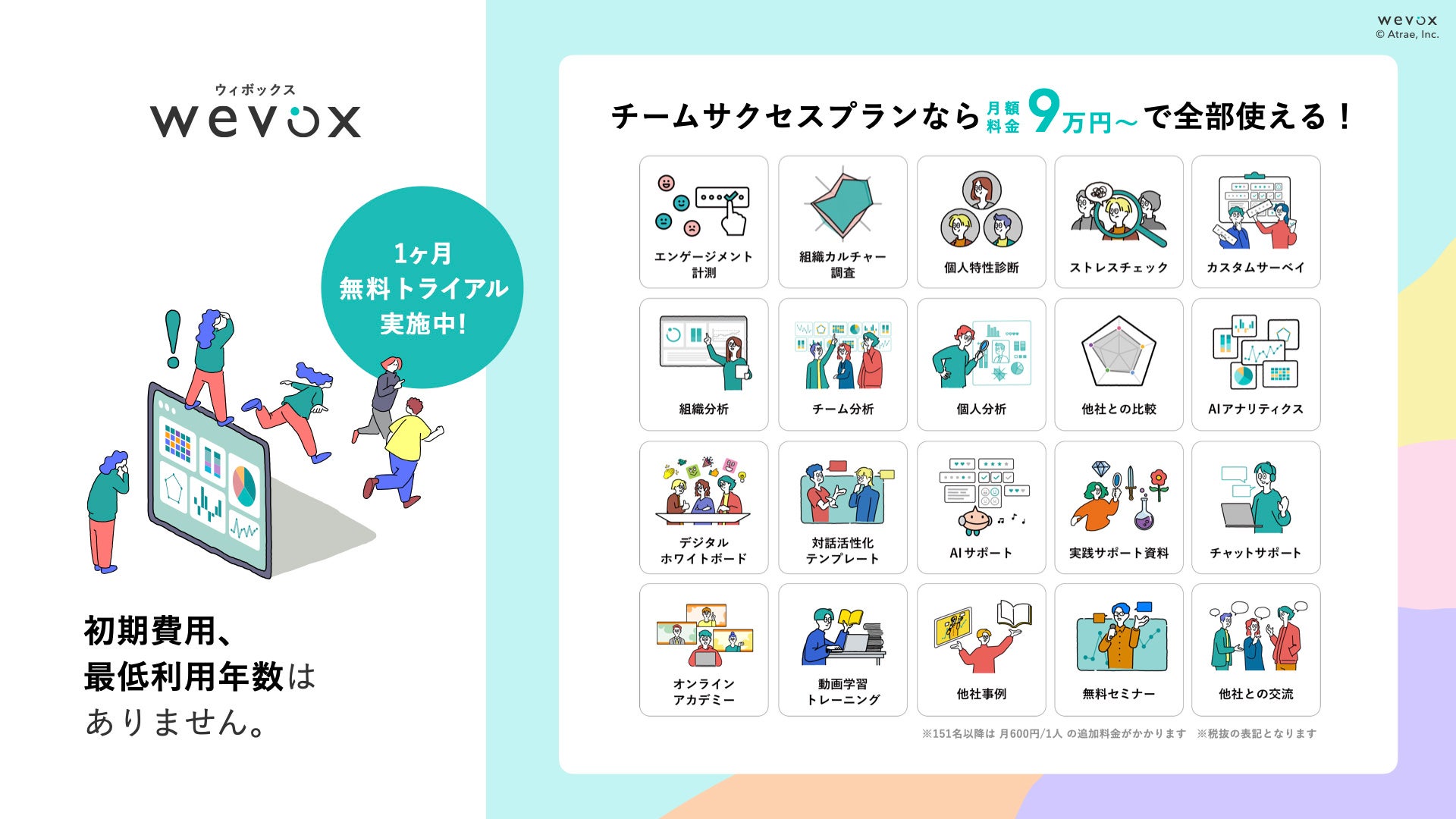 People Tech(テクノロジーによって人の可能性を拡げる)事業を展開する株式会社アトラエ(本社:東京都港区、代表取締役CEO:新居佳英、東証プライム:6194)が提供する組織力向上プラットフォーム「Wevox(ウィボックス)」は、2025年11月以降にお申し込みいただいたお客様より、新プランの提供を開始します。
