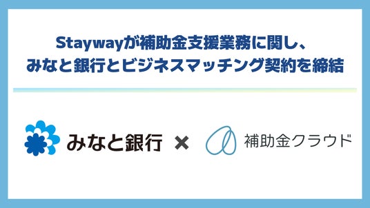 補助金支援のDXを通じた経営支援サービス「補助金クラウド」と補助金債権の早期資金化サービス「前ほじょくん」を運営する株式会社Stayway(本社:大阪府大阪市、代表取締役: 佐藤 淳、以下「Stayway」)は、株式会社みなと銀行(本社:兵庫県神戸市、代表取締役社長:武市 寿一、以下「みなと銀行」)とビジネスマッチング契約を締結いたします。