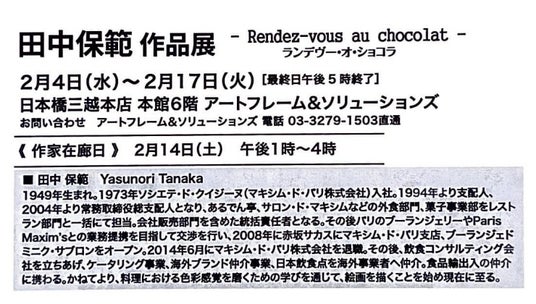 日本橋三越本店 本館6階 アートフレーム&ソリューションズでは、2026年2月4日(水)から2月17日(火)まで、田中保範氏による作品展「田中保範作品展 ― Rendez-vous au Chocolat(ランデヴー・オ・ショコラ)―」を開催いたします。
