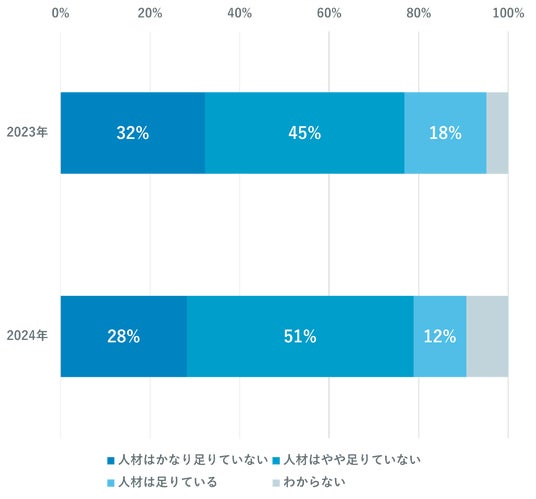 ▼「人材はかなり足りていない」と「やや足りていない」を合計すると79%。約8割が人材不足を感じる。2023年の77%から微増