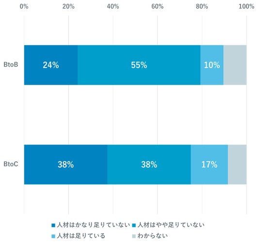 ▼「人材はかなり足りてない」の割合の高さはBtoCで目立つが、「やや足りていない」との合計ではBtoBの割合が79%と高い