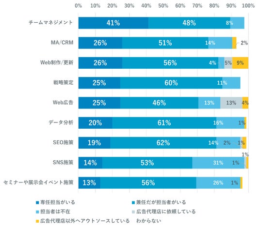 ▼専任担当がいる割合が高いのは「チームマネジメント」「MA/CRM」「Web制作/更新」
