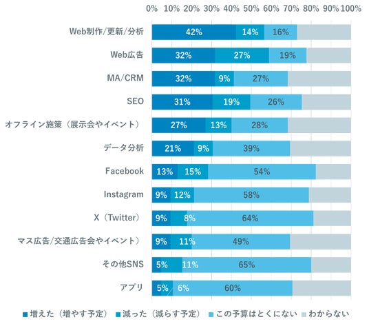 ▼「Web制作/更新/分析」「Web広告」「MA/CRM」が2023年比で予算増加のトップ3
