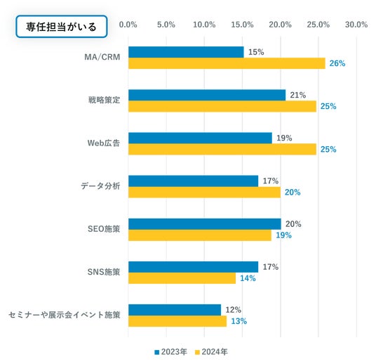 ▼2023年度比でみると「専任担当がいる」と回答した割合が増えているのは「MA/CRM」「戦略策定」「Web広告」「データ分析」
