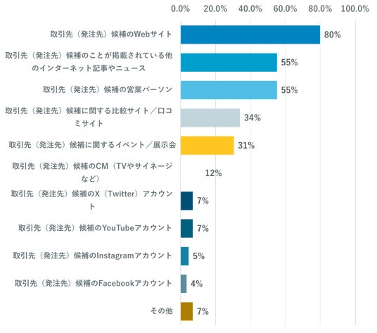 ▼取引先(発注先)候補を選ぶ際に参考にする情報は「取引先(発注先)のWebサイト」が約8割でトップ。「営業パーソン」を上回る