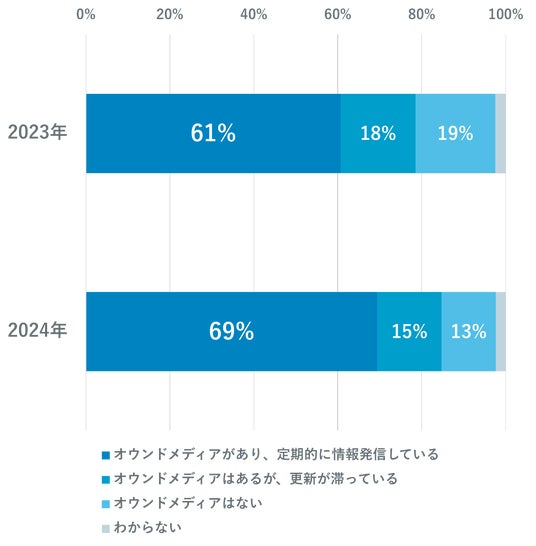 ▼約7割が「オウンドメディアで定期的に情報発信」。2023年よりも増加