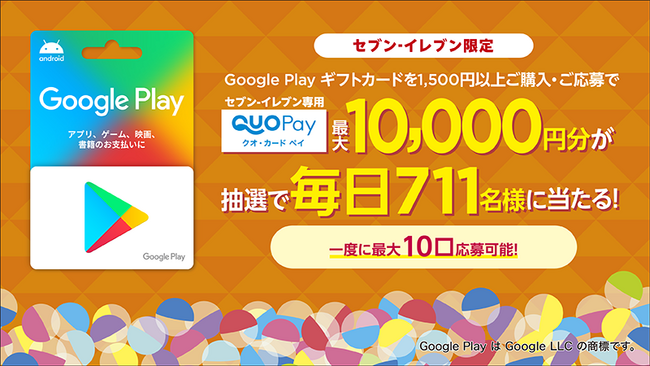 キャンペーン期間中、セブン‐イレブン店頭で Google Play ギフトカードを1,500円以上購入し、専用サイトより応募すると、抽選で毎日711名様に、最大10,000円分のセブン‐イレブン専用QUOカードPayがプレゼントされます。