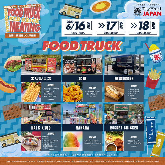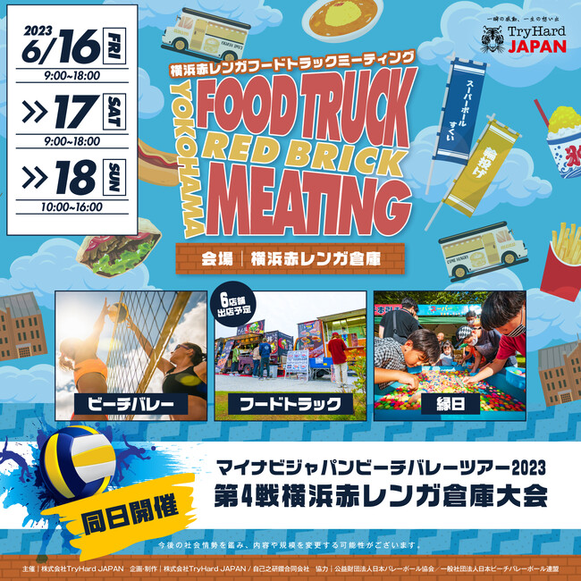 株式会社TryHard Japan(所在地:大阪市中央区)は、2023年6月16日(金)~18日(日)は横浜赤レンガ倉庫 イベント広場(所在地:横浜市中区)にて、「横浜赤レンガフードトラックミーティング」を開催いたします。