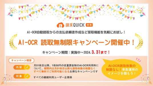 昨年10月に開始されたインボイス制度、また1月1日より改正電帳法で電子取引が義務化されましたが、当社ではAI-OCRの読取制限をなくすことで、料金を気にすることなく受取機能をお試しいただきたいとの思いから、継続利用ユーザー企業様向けに「AI-OCR読取無制限キャンペーン」を3月31日まで開催中です。ぜひこの機会に、AI-OCRを使った自動読取からの支払依頼書作成を含め「請求QUICK」の受取機能をご利用ください。