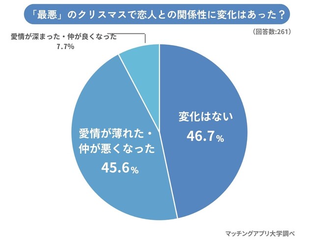 男女261人に最悪のクリスマスを過ごした後の愛情の変化について聞いたところ、46.7%の男女が「変化はない」と回答しましたが、一方で45.6%の男女が「愛情が薄れた・仲が悪くなった」と回答。約半数近くは関係性が悪化していたと判明しました。