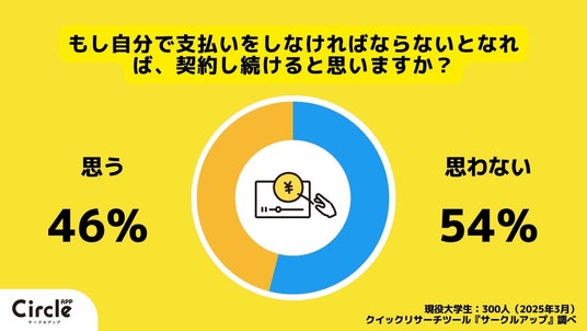 サブスクの料金を自分で支払っていない人に「もし自分で支払いをしなければならないとなれば、契約し続けると思いますか?」と問うと、54%が「思わない」と回答しました。