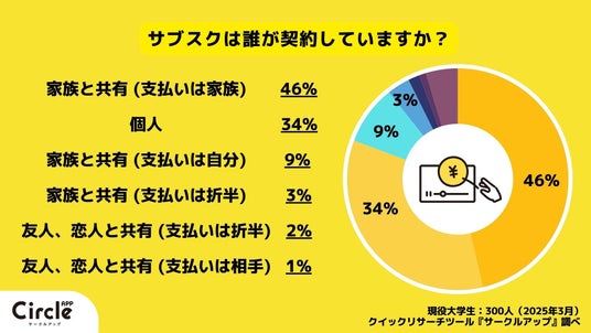 そこで、「サブスクを契約している」と回答した人にそのサブスクは誰が契約しているものなのかを尋ねたところ、「家族と共有(支払いは家族)」という回答が最も多く46%となりました。続く34%が「個人」、9%が「家族と共有(支払いは自分)」で契約していると回答したものの、約半数の学生は家族の負担でサブスクを利用していることが分かりました。