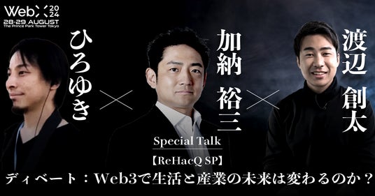 今回のディベートはReHacQ SPとして開催され、ひろゆき氏と加納氏に加えて、国内Web3事業をリードする渡辺創太氏が参加。『Web3で生活と産業の未来はどう変わるのか?』というテーマに基づき、議論がさらに具体的で深いものになることが期待されています。