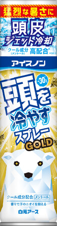 『アイスノン 頭を冷やすスプレーGOLD』は、暑い季節のレジャーやおでかけ、屋外の作業等に使えるエアゾールタイプの頭皮用冷却スプレーです。-30℃※1のジェット冷気が暑さでほてった頭をスッキリと冷やします。また、メントールの香りで、汗などの気になる頭のニオイを抑え、保湿成分として緑茶エキスと海藻エキスを配合し、夏の強い日差しでダメージを受けた頭皮にうるおいを与えます。今回、従来品※2よりもクール成分(メントール)を高配合し、汗をかくたびに、よりひんやり気持ちの良い冷涼感が続く処方に改良しました。POPシールには、“猛烈な暑さに頭皮ジェット冷却”のメッセージを表記し、消費者に暑さ対策として頭皮を冷やすことを促します。