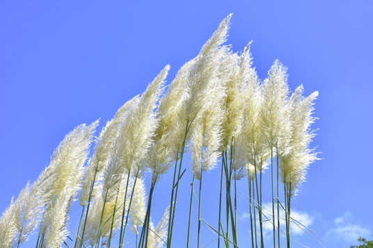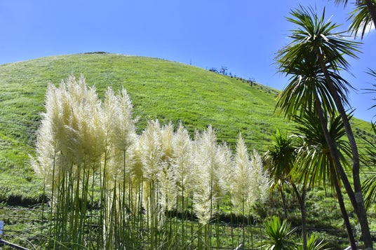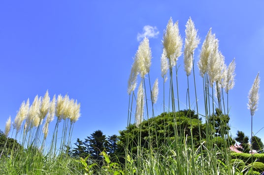 パンパスグラスの花期は9月~10月、草丈は1m~3mで、羽毛状の花穂は40cm~80cmになります。原産地はブラジル・アルゼンチン・チリなどで、温暖な草原地帯に生えているため、東北や北海道などの寒い地域では越冬ができない珍しい植物です。