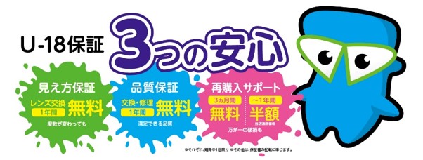お渡し時の年齢が18歳までの方はレンズの見え方保証として1年間のレンズ交換保証が可能です。メガネの愛眼はメガネを買う前や買った後も、お客様の気持ちに寄り添いサポート致します。