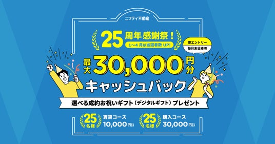 このたび「ニフティ不動産」は、おかげさまでサービス開始から25周年の節目を迎えます。これを記念し、2025年1月7日から4月30日までの期間限定で、「25周年感謝祭」の一環として、特別キャンペーンを実施いたします。
