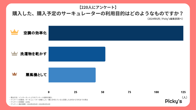「Picky’s」は、インターネットショッピングにおいて、購入前に試せない・選ぶべきものがわからないという課題の解決を目標に、あらゆる商品のおすすめランキングや検証レビューを紹介するサイトです。このたびPicky’s(https://rentry.jp/note/)では、夏需要に先駆けて、サーキュレーターについてインターネット上でアンケート調査を行いましたので発表いたします。