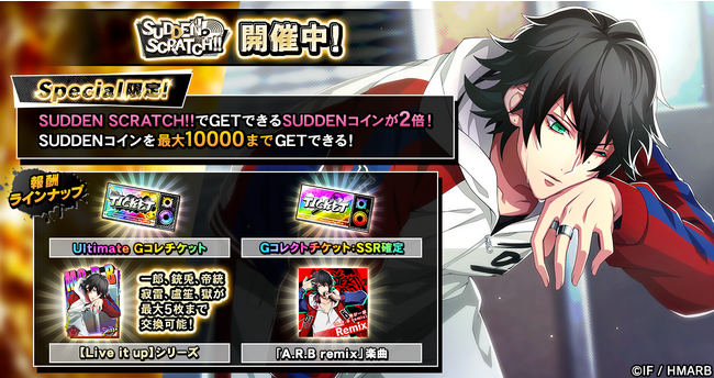 イベント期間中、KILLER SCRATCH!!をプレイするとライズ消費量に応じた確率でSUDDEN SCRATCH!!が発生します。SUDDEN SCRATCH!!をプレイすると、通常の報酬アイテムの他、限定アイテム「SUDDENコイン」を獲得することができます。「SUDDENコイン」を集めることで、「Ultimate Gコレチケット」やこれまでに登場したストーリーカード【Live it up】シリーズを最大5枚まで獲得できるほか、「A.R.B remix」楽曲などと交換することが可能です。Spacialの期間中は、SUDDENコインの獲得量が通常のSUDDEN SCRATCH!!の2倍になり、より集めやすくなっています。