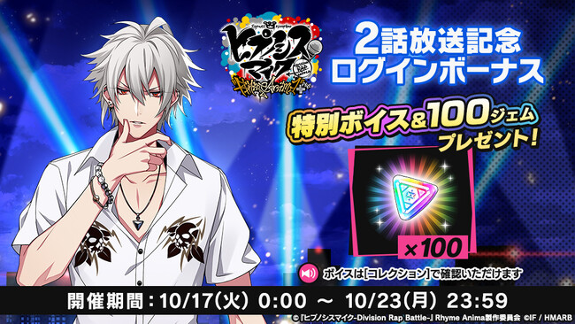 TVアニメ『ヒプノシスマイク-Division Rap Battle-』Rhyme Anima +の放送を記念したキャンペーンを実施しています。スペシャルログインボーナスやビンゴミッションで最大150回分の「Rhyme Anima + Gコレチケット」が獲得できるほか、アイテムセットの販売などを行っております。さらに、キャンペーン期間中対象のGコレクトにて[10回Gコレ]が初回無料で回せます。