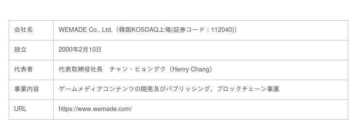 WEMADE Co., Ltd.は2000年2月韓国での設立以来、20年以上に渡り多くのゲーム開発経験と多様な事業ノウハウを基にブロックチェーン技術の大衆化を率いてきた先導的企業。独自メインネットコイン「WEMIX3.0」をトークノミクス設計し、様々なゲームサービス内でのブロックチェーンサービスを提供している。