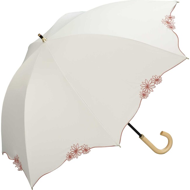 公園でゆっくり過ごす日もおしゃれと暑さ対策は忘れない。爽やかなオフホワイトの生地をベースに、オレンジの花柄刺繍が入ったおしゃれな日傘でカジュアルファッションとのコーディネートも楽しむことができる。通り抜ける風や移りゆく雲、変わる季節を感じながら元気なお日様と仲良くなろう。