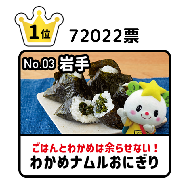 本グランプリでは、全国47都道府県の自治体と当社が連携し、ご当地食材を無駄なく活用する47レシピを開発し、レシピを活用したグルメに「食べてみたい」「応援したい」などを基準にした一般投票を募集しました。本グランプリには、全体で252,634票が集まり、72,022票を獲得した岩手の「わかめナムルおにぎり」がグランプリに輝きました。