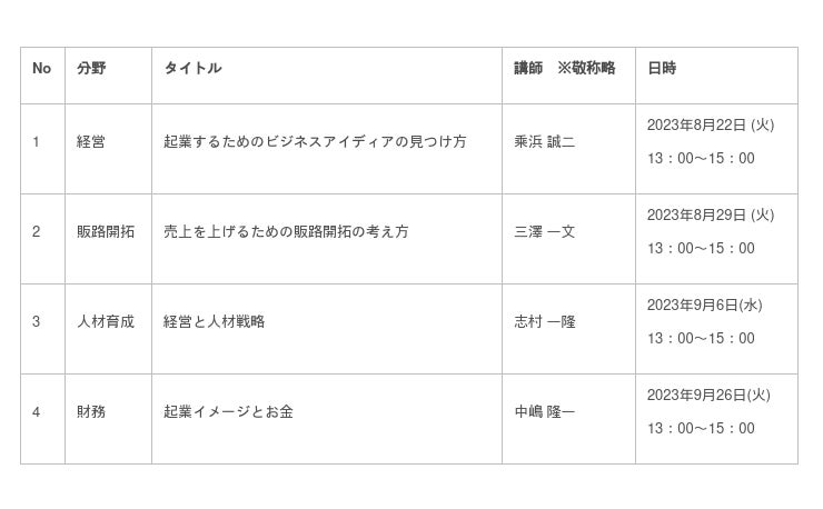 iUが主催者として、創業支援等事業(墨田区)として、本学教員による「iUスタートアップゼミ」を実施します。本ゼミは、「経営、財務、人材育成、販路開拓(以下、「4つの知識」)」が身につく内容とし、4回の講義を受け、すべて習得した者を「特定創業支援等事業を受けた者」とします。支援を受けた方は、会社設立時の登記にかかる登録免許税の軽減などの優遇措置を受けることができます。
