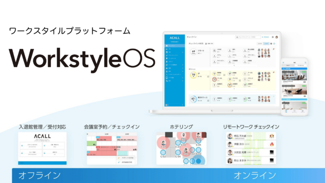 ACALLが提供している「WorkstyleOS(ワークスタイルオーエス)」は、オフィスの省人化を実現する機能や「誰が・どこで」働いているかをチームで共有し、コミュニケーションのきっかけを作り出す機能を備え、アプリケーションや外部サービス、IoTをつなぐことで、どこでも安心・安全・快適な働き方をサポートします。
