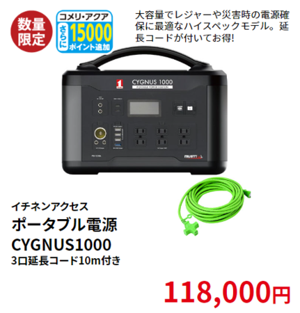 商品名:イチネンアクセス ポータブル電源 CYGNUS1000(3口延長コード10m付き)