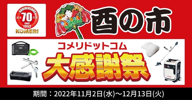 ホームセンターの「コメリパワー」や「コメリハード&グリーン」を通し地域のライフラインとして、地元のプロを応援する株式会社コメリ(所在地:新潟県 新潟市、代表取締役社長:捧 雄一郎)は、2022年11月2日(水)より、オンラインショッピングサイト「コメリドットコム」にて「酉の市 コメリドットコム大感謝祭」を開始いたします。