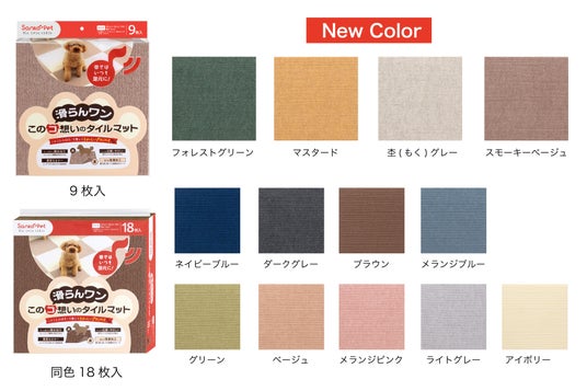 「このコ想いのタイルマット」は、“家族の一員であるペットのためを想ったマット”という想いを込めて開発された、ペットとオーナー様がともに安心して、長く快適に使える高機能マットです。このたび、パッケージデザインをリニューアル。ブランドカラーの赤を基調に、ブランドロゴや肉球のイラストをあしらい、可愛らしさとあたたかさ、ぬくもりが感じられるデザインに生まれ変わりました。さらに、新たに4色のカラーバリエーションが加わります。現代のインテリアに馴染みやすい「スモーキーベージュ」「モクグレー」、お部屋のアクセントとして楽しめる「フォレストグリーン」「マスタード」の全4色。それぞれ多色の綿を組み合わせた立体感のある仕上がりで、落ち着いた色味ながらも豊かな表情を楽しめるカラーです。