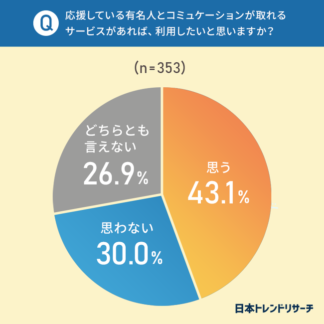 自分の好きな有名人とコミュニケーションが取れるサービスがあれば利用したいと思うか聞いたところ、利用したいと「思う」が43.1%、「思わない」が30.0%、「どちらとも言えない」が26.9%でした。