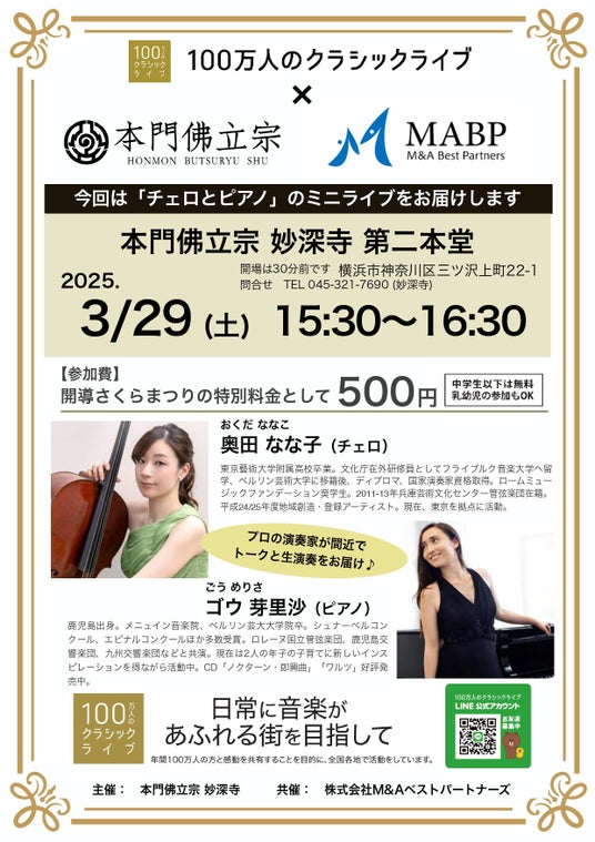 製造、建設、不動産、医療・ヘルスケア、物流、ITに特化したM&A仲介を行う株式会社M&Aベストパートナーズ(本社:東京都千代田区、代表取締役社長:齋藤 達雄 以下M&Aベストパートナーズ)と、一般財団法人100万人のクラシックライブ(東京都千代田区、代表理事:蓑田秀策 以下100万人のクラシックライブ)は、3月29日(土)15:30より、本門佛立宗 妙深寺にて、クラシックライブを開催することをお知らせいたします。