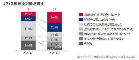 旺盛なオフィス移転需要に対し、賃貸オフィスは供給不足に陥っている。移転を検討したが断念した回答割合が2.8pt上昇しており、その理由として「費用対効果が見合わない(前回比+17.1pt)」や「移転先が見つからない(前回比+9.7pt)」といった理由が大幅に増加した。
