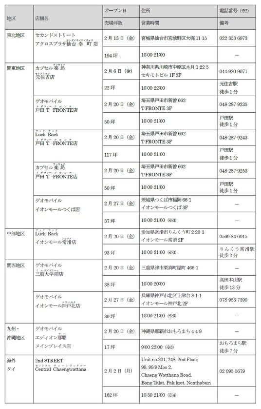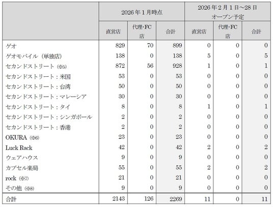 新たに、セカンドストリート2店舗、ゲオモバイル5店舗、ラックラック2店舗、カプセル楽局2店舗の合計11店舗が2026年2月度にオープンします。
