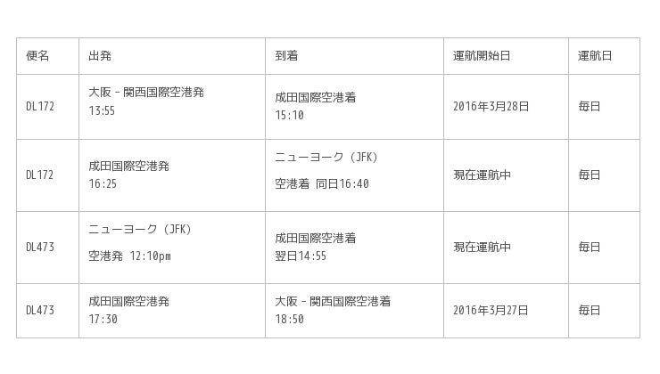 【東京/大阪、2015年6月15日】 – デルタ航空(NYSE:DAL)は、2016年3月27日より、国際線乗り継ぎ客専用の成田国際空港-関空国際空港路線の運航を再開します。同路線は、現行の成田-ニューヨーク(JFK)線に接続され、関空発成田経由ニューヨーク便として運航します。関西のお客様は、ニューヨークを始めとする米国本土7都市に成田空港経由でスムーズにアクセスすることができるようになります。