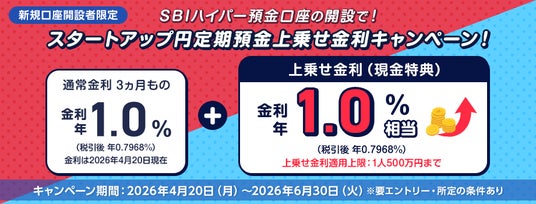 株式会社SBI新生銀行(東京都中央区、代表取締役社長 川島 克哉、以下「SBI新生銀行」)は、2026年4月20日(月)より、新たに当行で口座を開設されたお客さまを対象とした「スタートアップ円定期預金 上乗せ金利キャンペーン」(お問合せ番号:2609)を開始いたします。