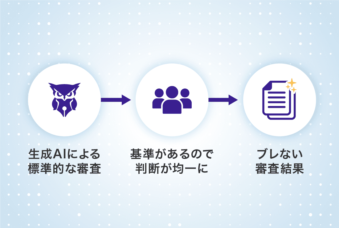 生成AIが一貫した基準でレビューを行い、判断のばらつきを抑えることで、審査結果の標準化を実現します。