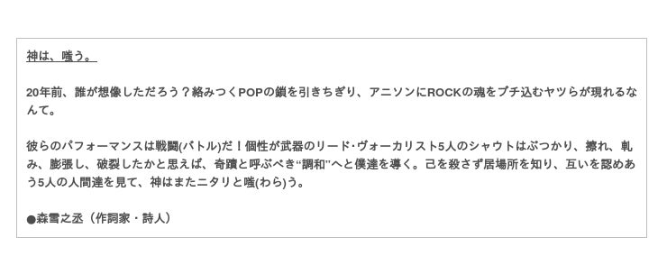 作詞家で詩人の森雪之丞からはコメントならぬJAM Projectの存在、そしてパフォーマンスを激烈に表現した“詩”が届きました。その全文を掲載します。