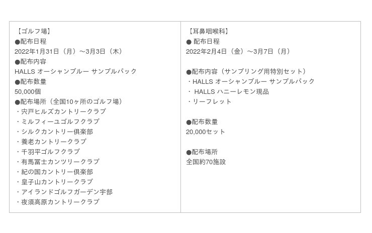 モンデリーズ・ジャパン株式会社(本社:東京都品川区 / 代表取締役社長:福本 千秋 / 以下:モンデリーズ・ジャパン)は、「のど・はなスッキリ!*」のリフレッシュメント・キャンディブランド「ホールズ」の大型サンプリングを実施。現在、全国のゴルフ場および耳鼻咽喉科で、2022年3月上旬まで、合計7万個の「ホールズ」を配布しています。また同時にTwitterにて、電子マネーギフトが当たる「あなたの“のど・はなスッキリ!”投稿キャンペーン」も実施中。
