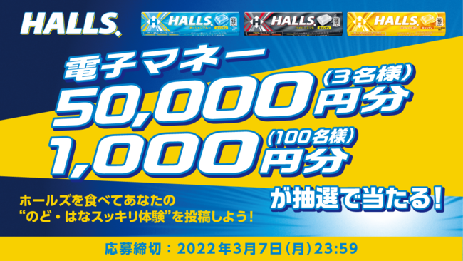「ホールズ」では同時に、2022年3月7日(月)まで、Twitterキャンペーンを実施しています。「のど・はなスッキリ体験」を、キャンペーン指定ツイート内から投稿すれば応募が完了する、誰でも参加できるキャンペーンです。