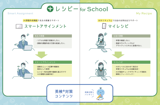 レシピー for School は、生徒の自学自走を促し、先生の課題を解決することを目的とした全く新しいAI英語学習サービスとして、2023年より教育機関向けプログラムとして提供をスタートしております。