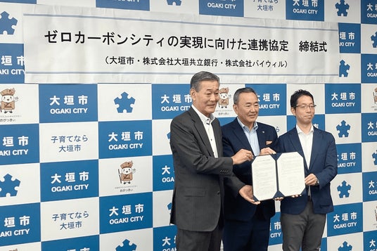 日本全国47都道府県のカーボンニュートラル実現を目指す株式会社バイウィル(本社:東京都中央区、代表取締役社長:下村 雄一郎、以下「バイウィル」)は、岐阜県大垣市(市長:石田 仁、以下「大垣市」)、株式会社大垣共立銀行(本店:岐阜県大垣市、取締役頭取:林 敬治、以下「大垣共立銀行」)と、ゼロカーボンシティの実現に向けた連携協定を締結しました。